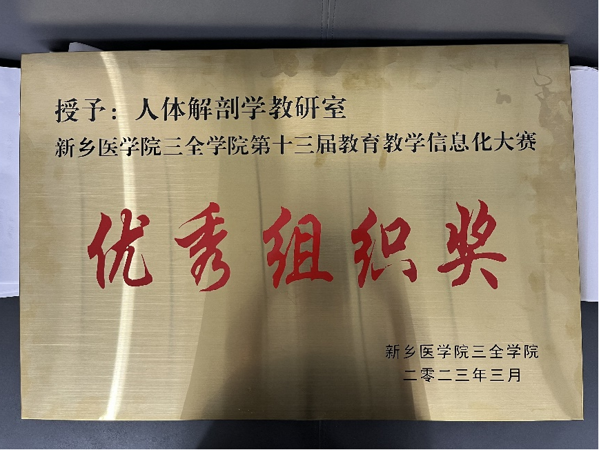 人体解剖学教研室获新乡医学院三全学院第十三届教育教学信息化大赛优秀教学组织奖